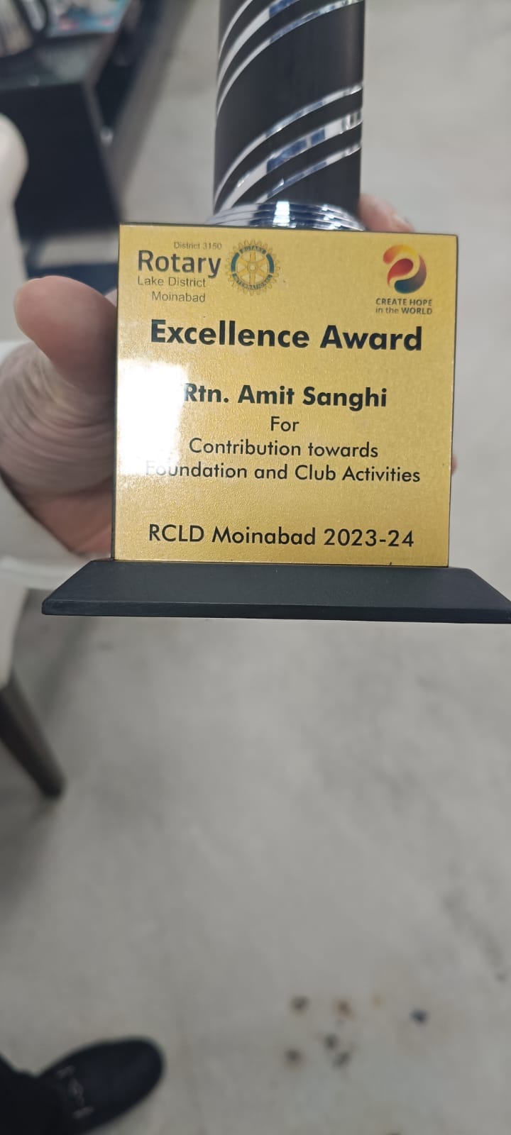 Rotary club of lake district moinabad awarded to AMIT SANGHI contribution towards foundation and club activities